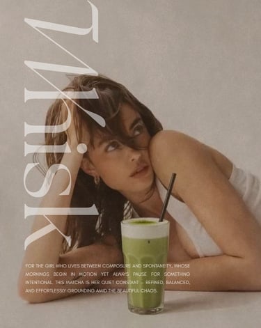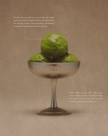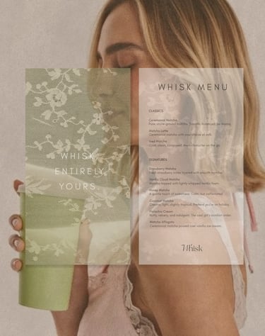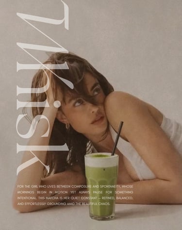 The matcha brand for girls who are trying to have their life together. She's mostly organised, a little chaotic and fully committed to romanticising her mornings. One minute she's running late, the next she's sipping a strawberry matcha like everything is under control. Whisk is matcha with personality, fun flavours, cute cups, playful tools and a café you pop into for a quick pick-me-up before work, pilates or whatever the day throws at you. It's energising without being intense, wellness without the guilt and calm. This is a matcha for people who want to feel good but still have fun doing it.